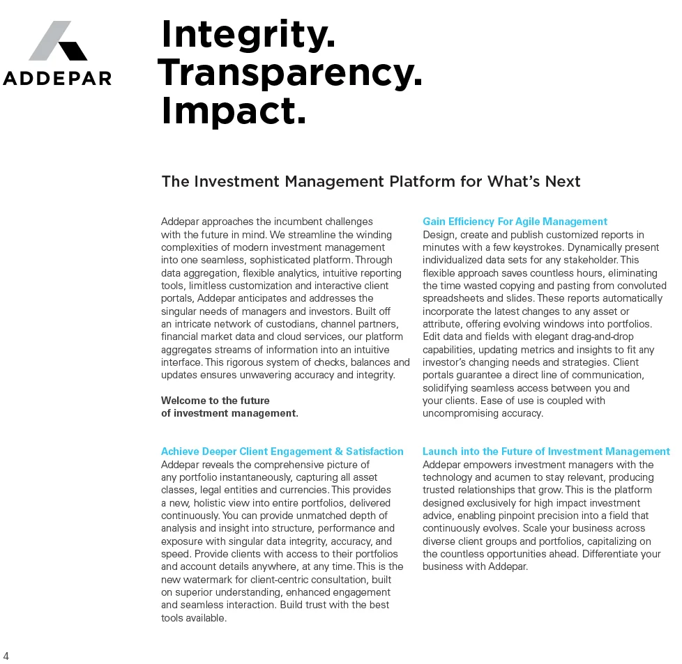 Following my time at 2Checkout, Silicon Valley startup Addepar recruited me to rebrand/rewrite their consumer-facing materials. Addepar is a reporting platform designed for analyzing complex portfolios. If a client owns a thoroughbred racing horse, a Paul Gauguin painting, and a sprawling stock portfolio, Addepar can take all of those inputs, streamline various metrics, and produce a sum total that updates in real time. More than a tool for assessing value, Addepar also demystifies the sources of income and their journeys, offering a transparent overview that can expose illegal and unethical activity.